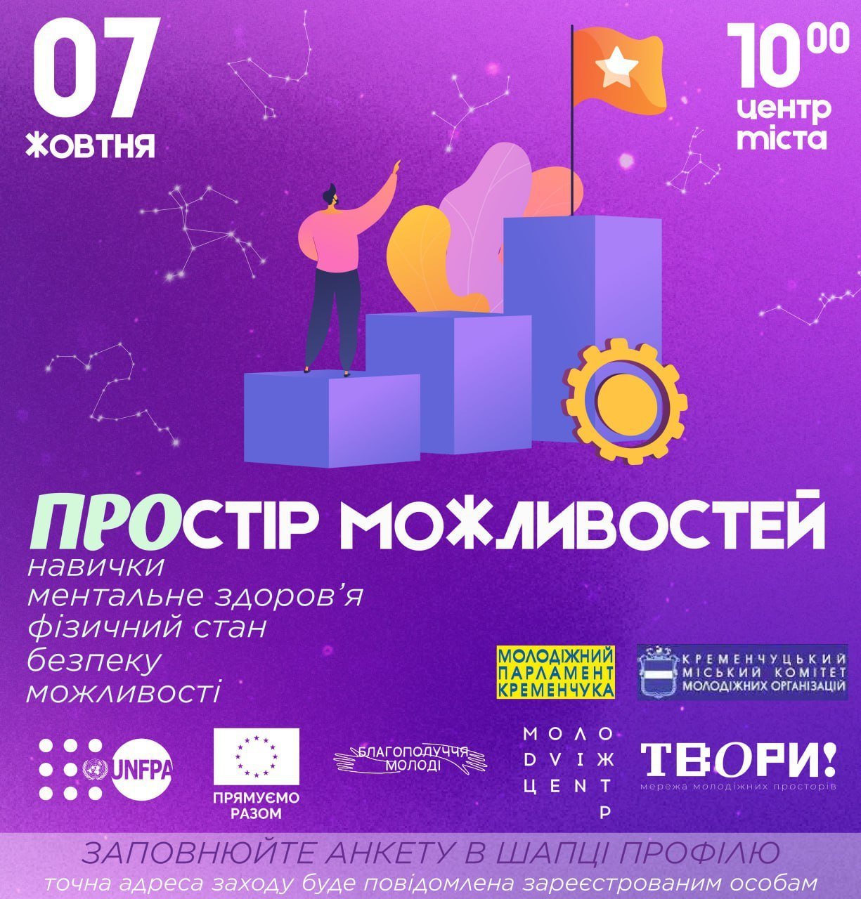 Подія «ПРОстір можливостей» відбудеться 7 жовтня з 10.00 до 14.00 в центральній частині міста (точну локацію організатори додатково повідомлять зареєстрованим людям). Під час реєстрації можна обрати цікавий для вас тренінг/семінар та зручний час. Реєстрація до 5 жовтня за посиланням.
