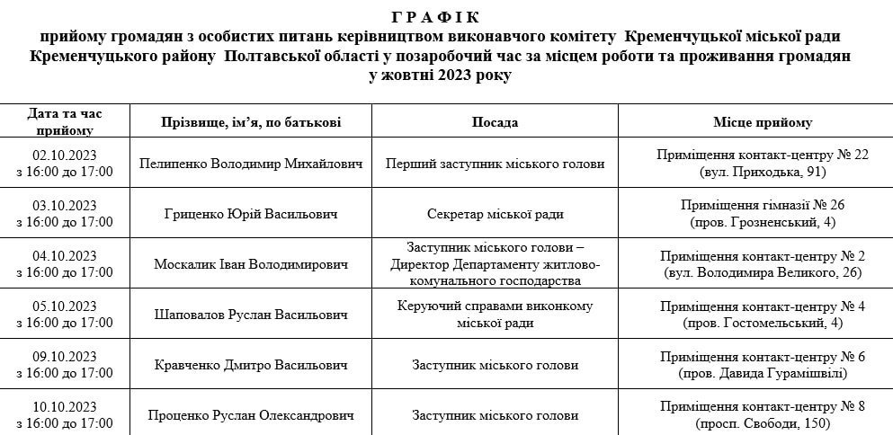Графік, за яким керівництво Кременчука прийматиме містян у жовтні