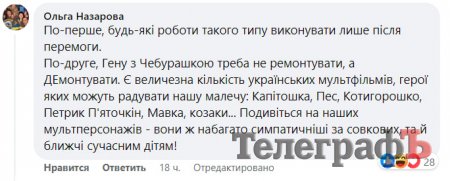 – По-перше, будь-які роботи такого типу виконувати лише після перемоги. По-друге, Гену з Чебурашкою треба не ремонтувати, а ДЕмонтувати. Є величезна кількість українських мультфільмів, герої яких можуть радувати нашу малечу: Капітошка, Пес, Котигорошко, Петрик П'яточкін, Мавка, козаки... Подивіться на наших мультперсонажів - вони ж набагато симпатичніші за совкових, та й ближчі сучасним дітям! – коментує Ольга Назарова.