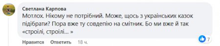 – Мотлох. Нікому не потрібний. Може, щось з украінських казок підібрати? Пора вже ту совдепію на смітник. Бо ми вже й так «строілі, строілі…» – коментує Світлана Карпова.