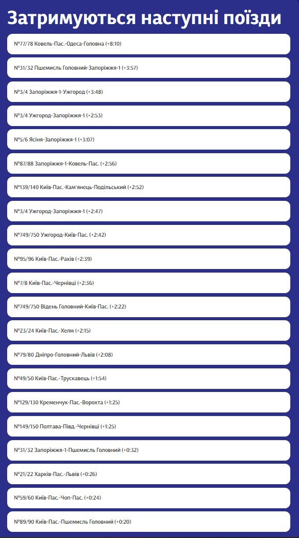 Згідно з графіком поточних затримок поїздів внаслідок прямування зміненим маршрутом, потяг №129/130 Кременчук-Пас.-Ворохта затримується на 1 годину 25 хвилин. Тобто мав прибути на вокзал Кременчука об 11.12.