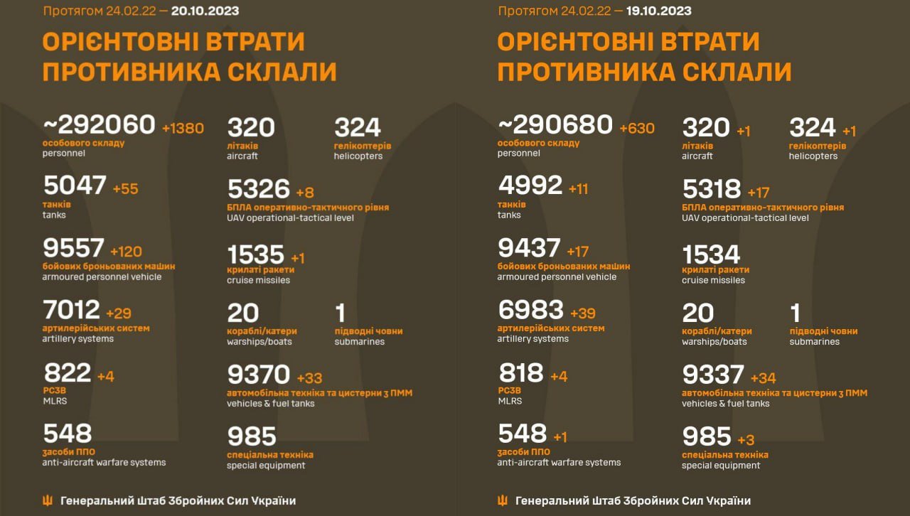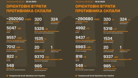 Для порівняння надаємо втрати ворога за даними Генштабу ЗСУ станом на ранок вчора та ранок сьогодні - за кількома позиціями різниця становить від 2-х (по особовому складу) до 5 (по танках) та 7 (по ББМ) разів!
