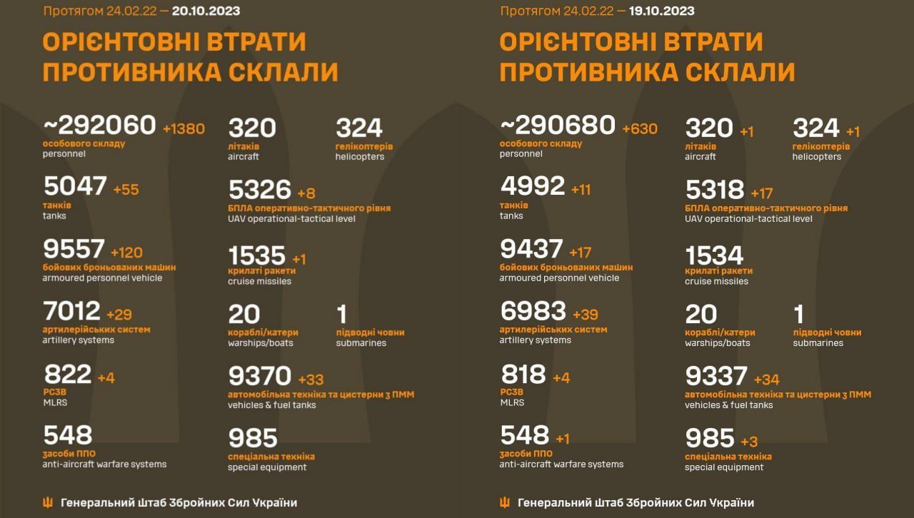 Для порівняння надаємо втрати ворога за даними Генштабу ЗСУ станом на ранок вчора та ранок сьогодні – за кількома позиціями різниця становить від 2-х (по особовому складу) до 5 (по танках) та 7 (по ББМ) разів!