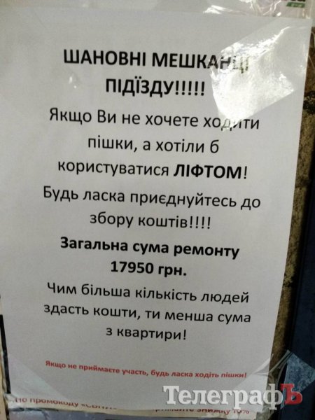 На деяких під'їздах кременчуцьких багатоповерхівок з’явилися оголошення про необхідність проведення капітальних ремонтів ліфтів. І жителі цих під'їздів обурені тим, що їм пропонують скинутися грошима на ці ремонтні роботи.