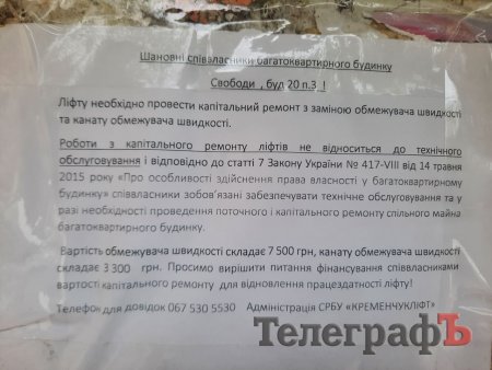 До прикладу, в оголошенні на одному з під'їздів будинку на просп. Свободи, 20 СРБУ «Кременчукліфт» зазначає, що для того, щоб ліфту необхідно провести капітальний ремонт із заміною обмежувача швидкості за 7 500 тис. грн і канату обмежувача швидкості за 3 300 грн.