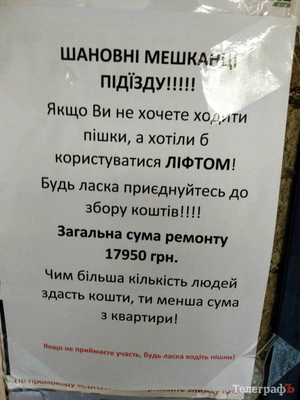 Наприкінці оголошень «Кременчукліфт» просить розв’язати питання фінансування співвласниками вартості ремонтних робіт для відновлення працездатності ліфтів, адже роботи з капітального ремонту ліфтів не належать до технічного обслуговування.