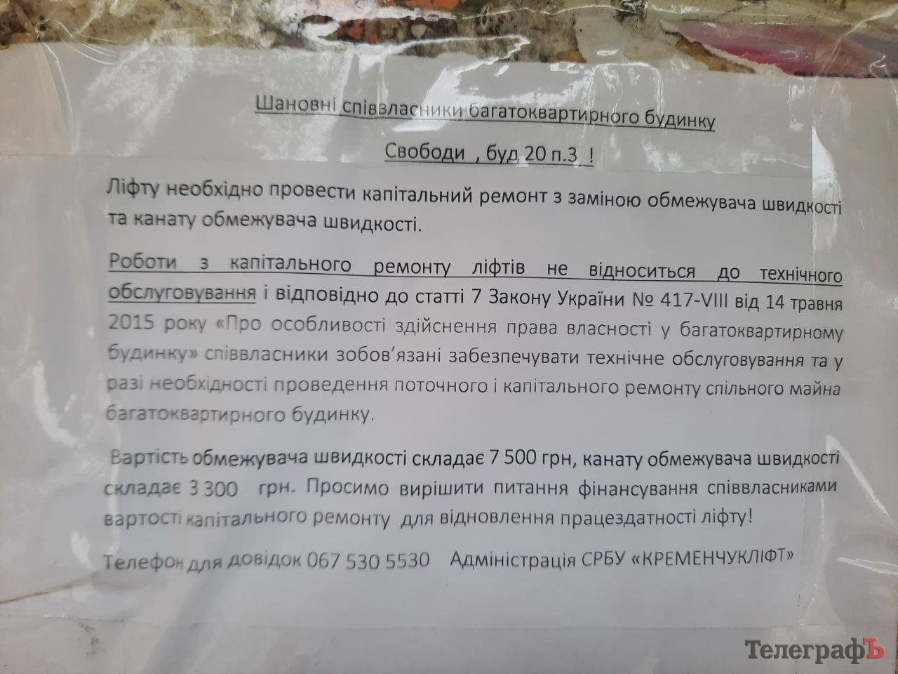 До прикладу, в оголошенні на одному з під’їздів будинку на просп. Свободи, 20 СРБУ «Кременчукліфт» зазначає, що для того, щоб ліфту необхідно провести капітальний ремонт із заміною обмежувача швидкості за 7 500 тис. грн і канату обмежувача швидкості за 3 300 грн.