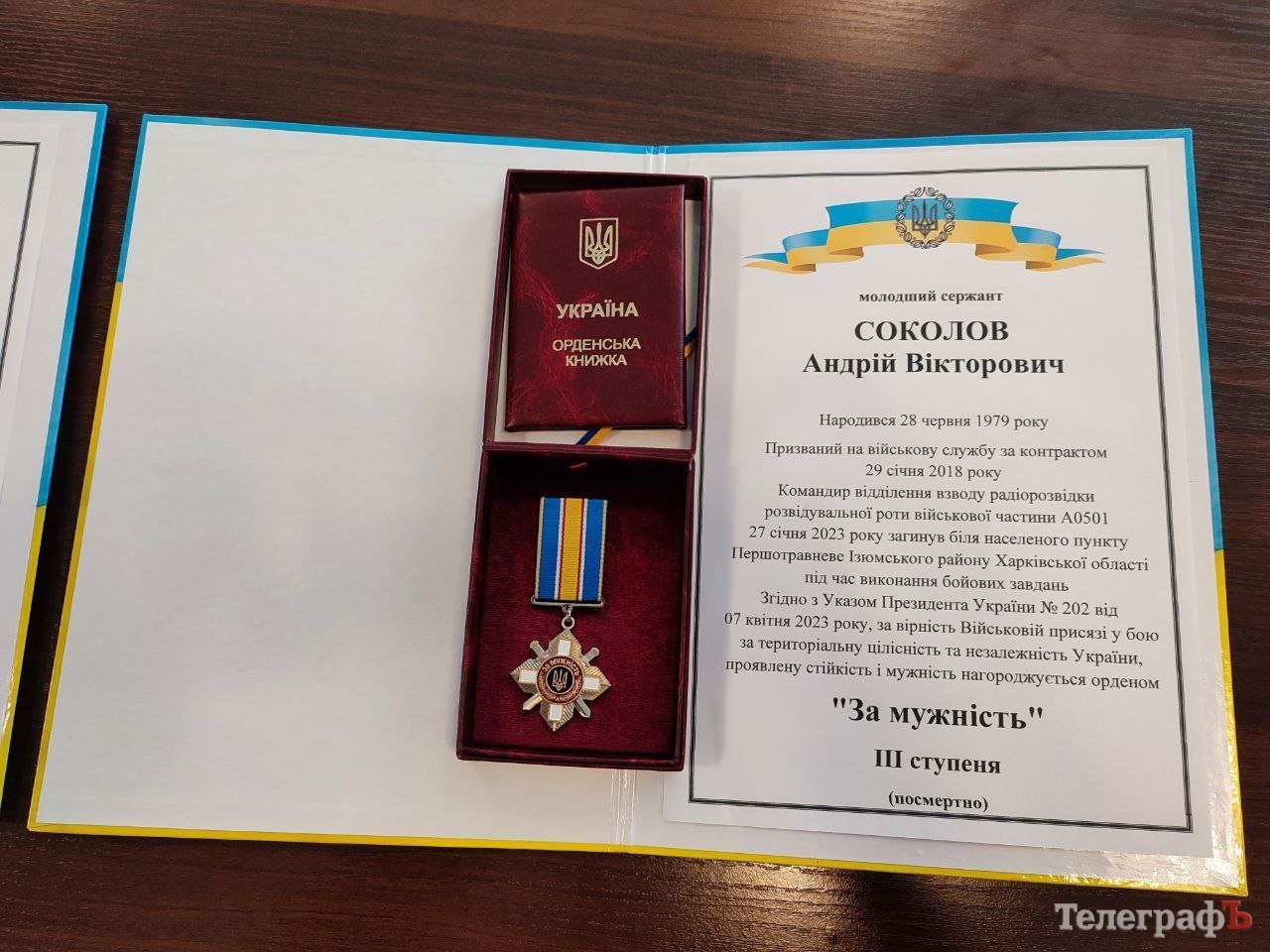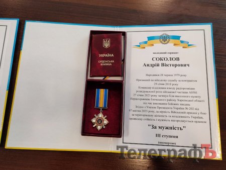 Другим державну нагороду вручили дружині загиблого захисника Соколова Андрія Вікторовича – Оксані, яка прийшла на нагородження разом з двома малолітніми дочками. Указом Президента України №202 від 7 квітня 2023 року, за особисту мужність, проявлену стійкість та героїзм, вірність Військовій присязі, виявлені у боях за Україну він був посмертно нагороджений орденом «За мужність» ІІІ ступеня.