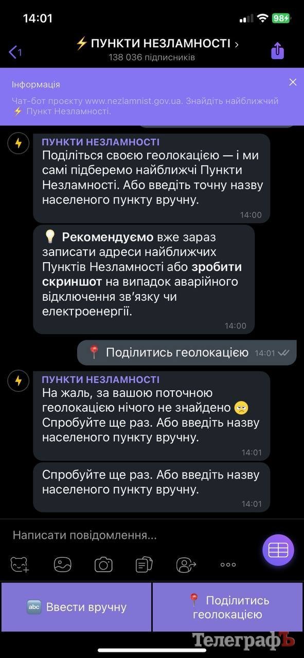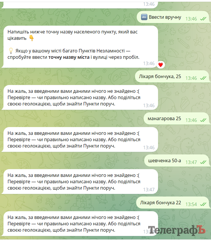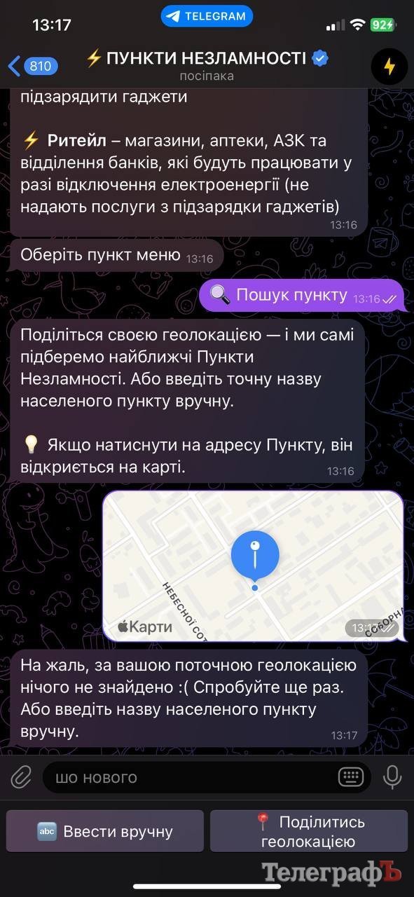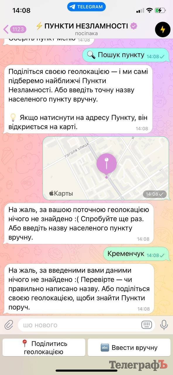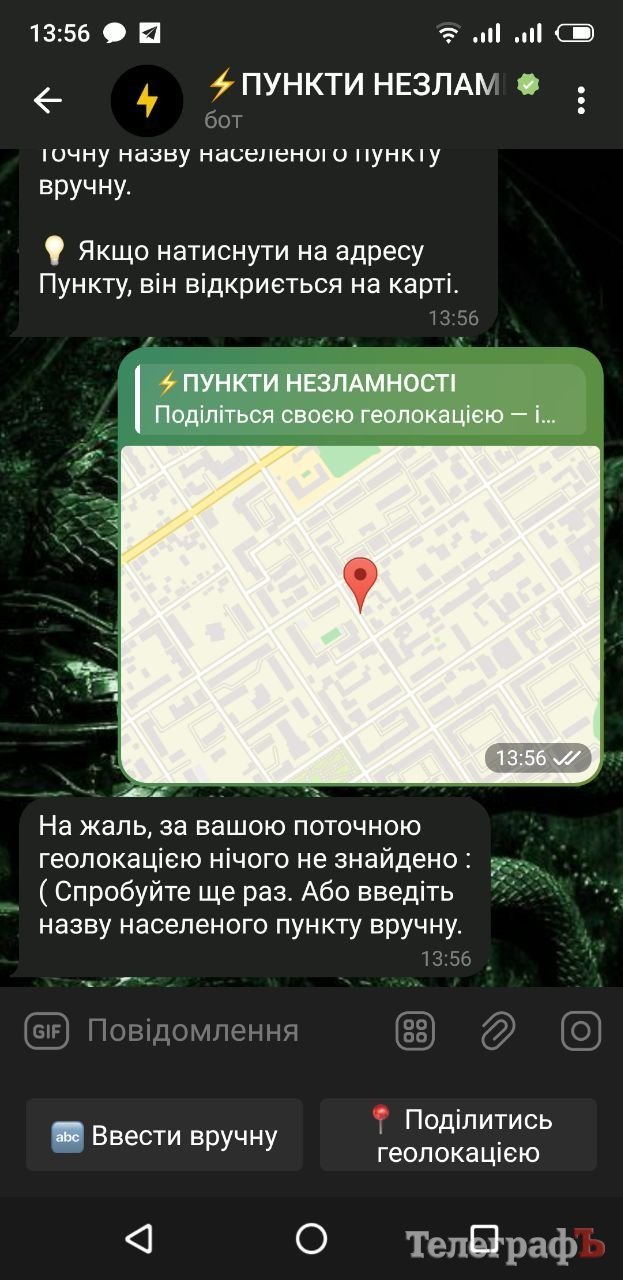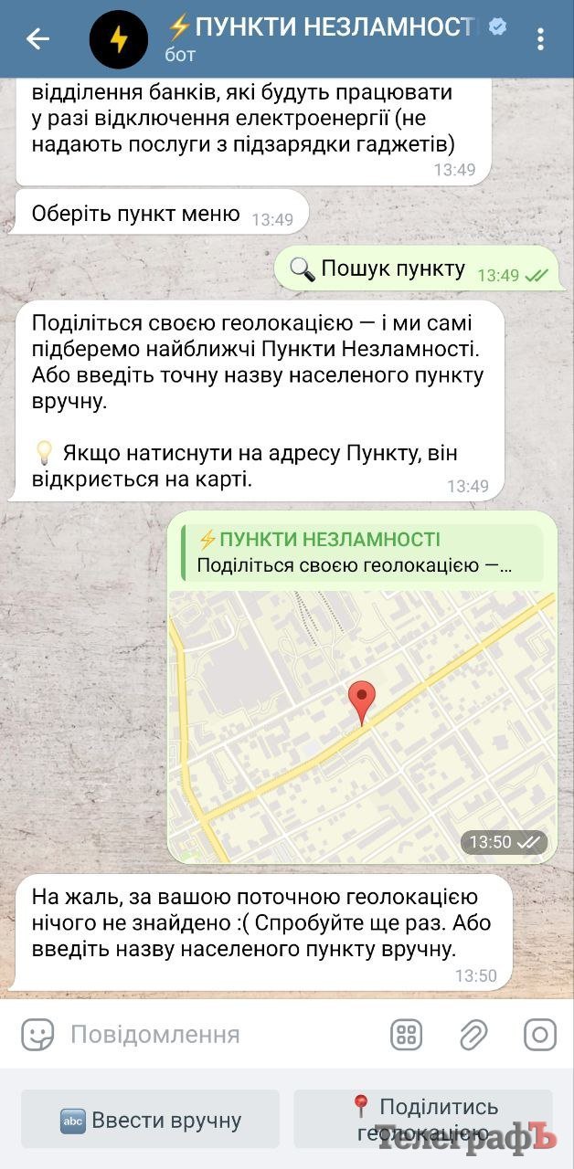Ми вводили геолокацію — ймовірно, бот мав би вказати найближчий пункт, проте бот «відповідав»: «На жаль, за вашою поточною геолокацією нічого не знайдено :(Спробуйте ще раз. Або введіть назву населеного пункту вручну».