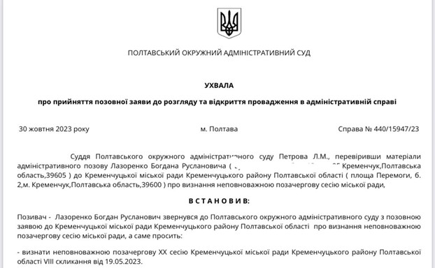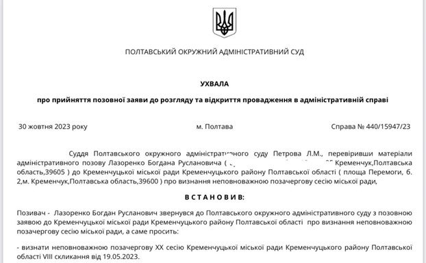 Інший позов стосується правомочності сесії Кременчуцької міської ради від 19.05.2023 року, яка відбувалася всупереч діючому законодавству та чинному Регламенту Кременчуцької міської ради, з порушенням визначених законом процедур організації пленарного засідання. На думку депутата: зібрання частини депутатського корпусу в сесійній залі, за відсутності кворуму і голосування в мобільному застосунку Вайбер, шляхом натискання сердечок, категорично не відповідає тому, що називається сесією міської ради.