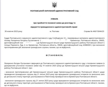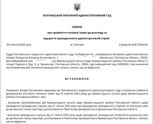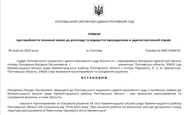 Останнє відкрите провадження, за позовом депутата Лазоренка, який є членом територіальної громади, стосується, власне законності прийняття самого рішення, «Про початок внесення змін до детального плану території Північного промвузла міста Кременчука», яке також розглядалося на травневій сесії.