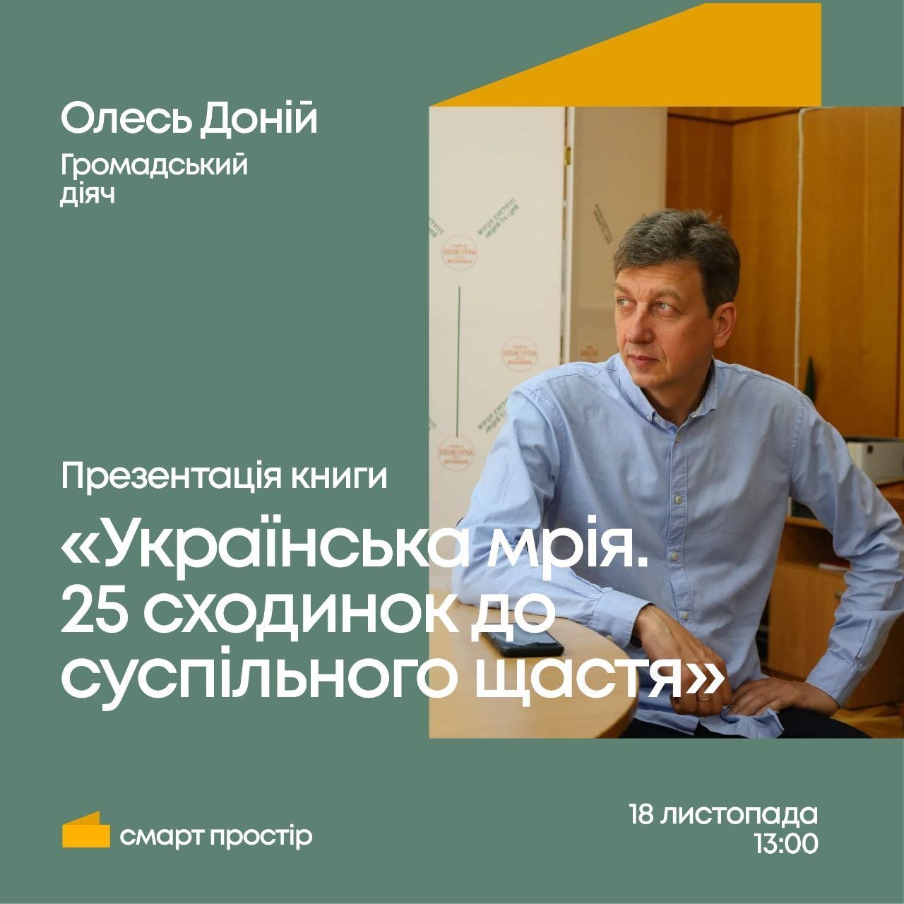 У суботу, 18 листопада, у селищі Козельщина, о 13.00 Олесь Доній презентуватиме книгу «Українська мрія. 25 сходинок до суспільного щастя». Про це повідомили у Телеграм-каналі «Смарт Простір».