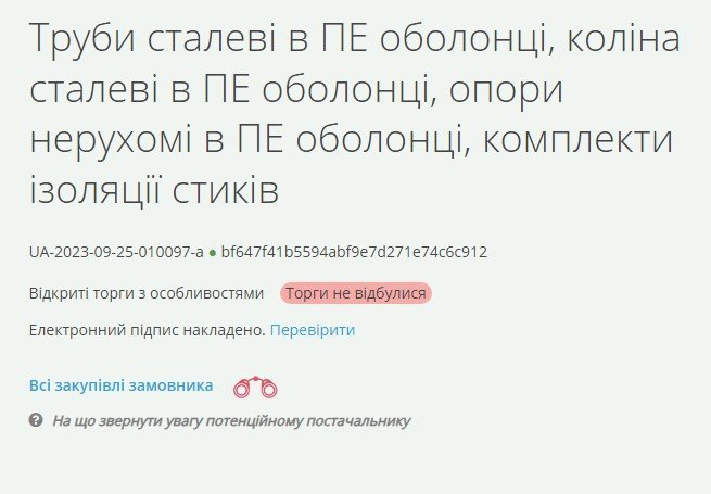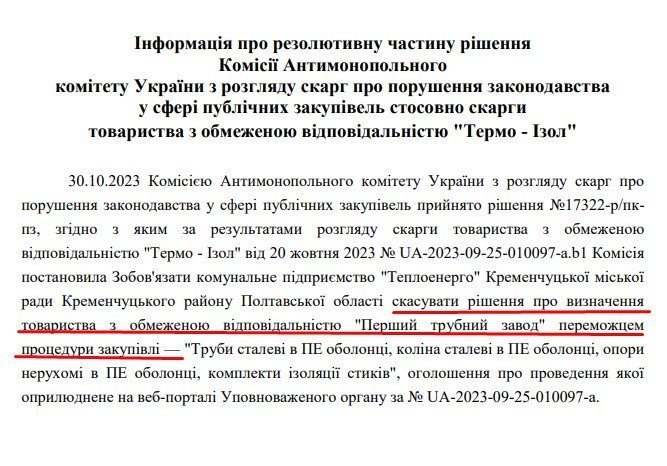 Комунальне підприємство «Теплоенерго» провело відкриті торги з особливостями на закупівлю пів кілометра сталевих труб та стиків, кріплень до них. Інформація розміщена в системі Prozorro. Очікувана вартість закупівлі склала 7 млн 170,5 тис. грн. На аукціон, який відбувся 9 жовтня, прийшло два учасники — львівське ТОВ «Термо-Ізол» та київське ТОВ ПТЗ («Перший трубний завод»). Замовник у підсумку визнав торги такими, що не відбулися, бо сам припустився помилки у визначенні переможця. На цю помилку вказав Антимонопольний комітет, розглянувши скаргу ТОВ «Термо-Ізол».
