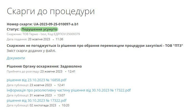 Антимонопольний комітет погодився з аргументами скаржника та зобов’язав КП «Теплоенерго» усунути порушення: скасувати рішення про визнання ТОВ ПТЗ переможцем закупівлі. Замовник виконав рішення Антимонопольного комітету.