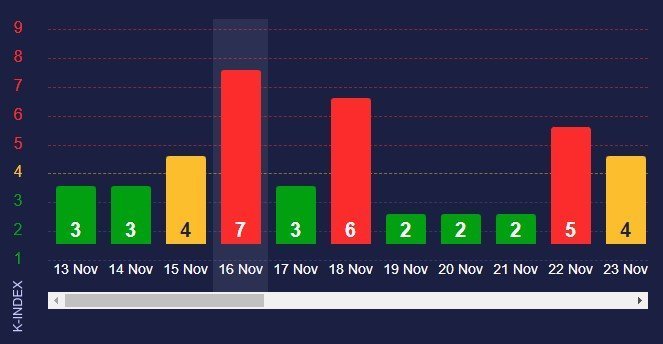 Сьогодні, 16 листопада, Землю накрила потужна магнітна буря. Згідно з даними сайту Meteoagent, К-індекс перевищив відмітку 7 за шкалою від 0 до 9.
