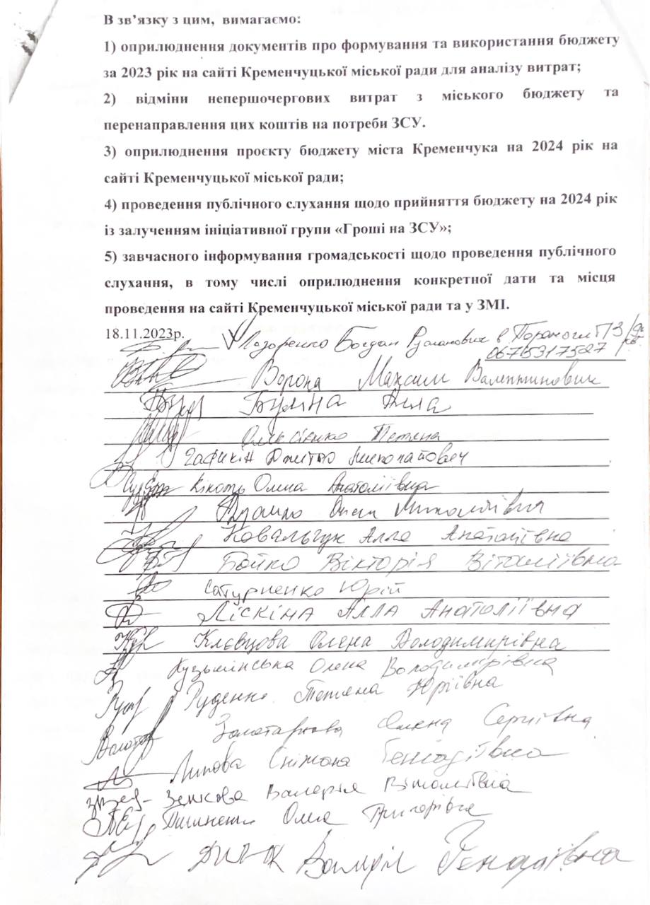 У зверненні учасники акції вимагають завчасного оприлюднення проєкту міського бюджету на 2024 рік, проведення публічних слухань щодо прийняття бюджету на 2024 рік із залученням представників ініціативної групи «Гроші на ЗСУ», та завчасного інформування громадськості.