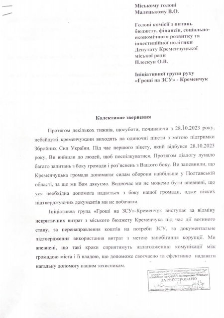 Учасники ініціативної групи «Гроші на ЗСУ», які щосуботи збираються під стінами мерії, написали колективне звернення міському голові Віталію Малецькому та голові бюджетної комісії Олександру Плескуну, про що редакцію повідомив депутат міської ради Богдан Лазоренко, якому вони це звернення передали.