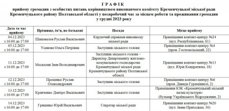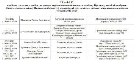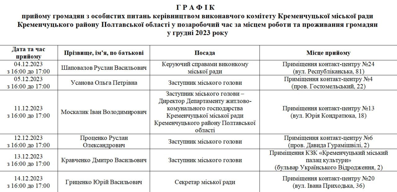 Кременчуцька міська рада опублікувала графік прийому громадян на грудень. Про це інформує пресслужба мерії на сторінці у Телеграмі.