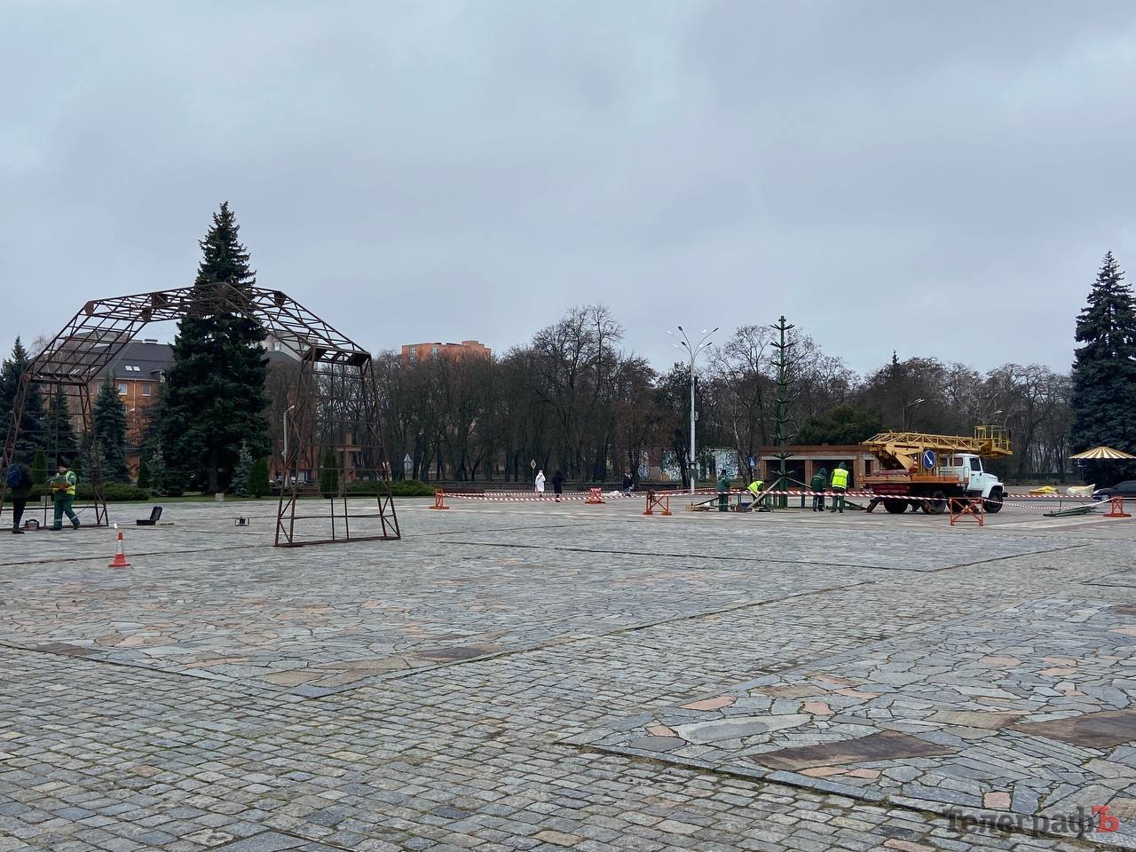 Сьогодні, 2 грудня, у Кременчуці почали монтувати головну ялинку на площі Перемоги. Комунальники вже встигли встановити каркаси новорічного деревця та арки.