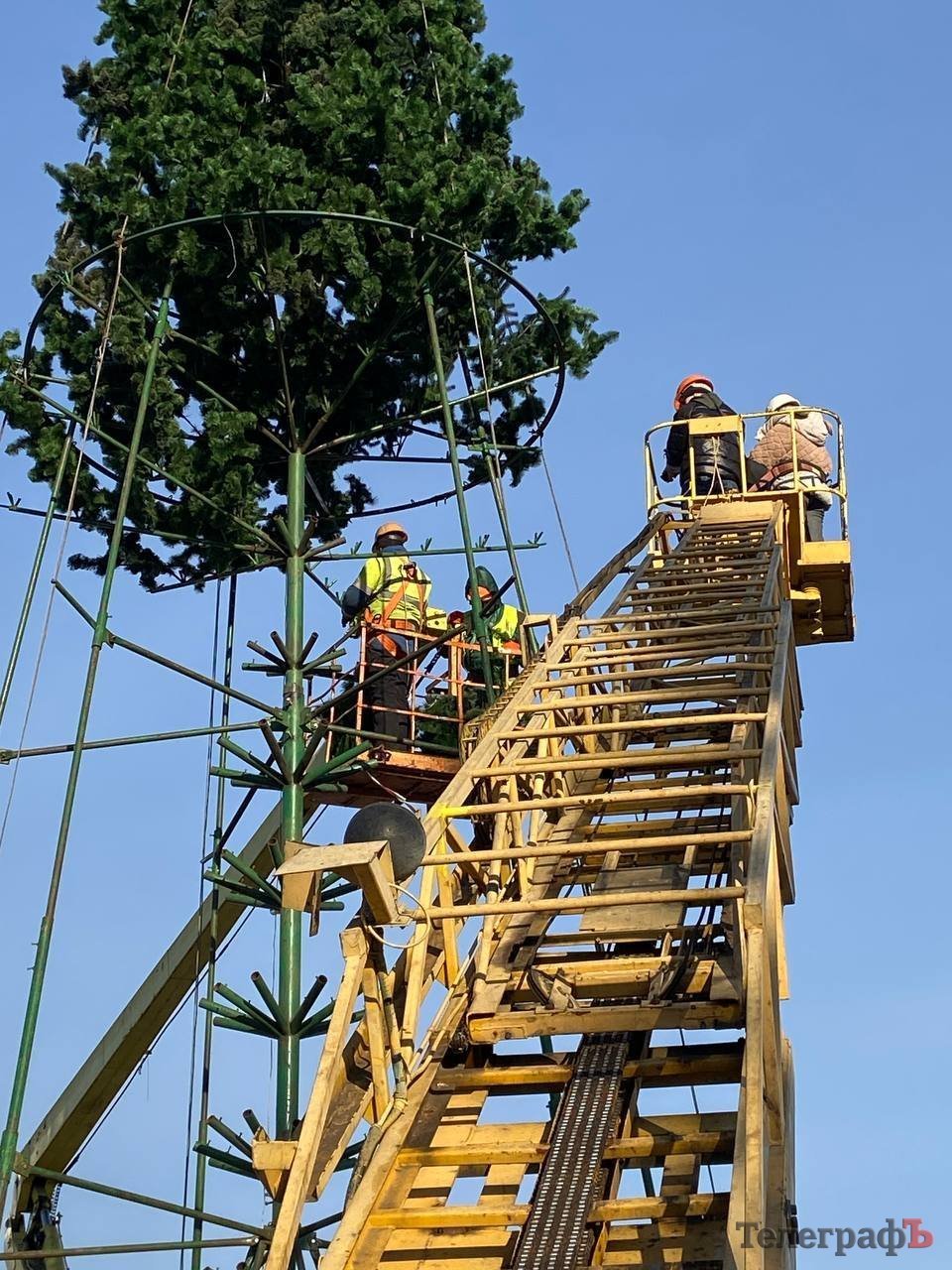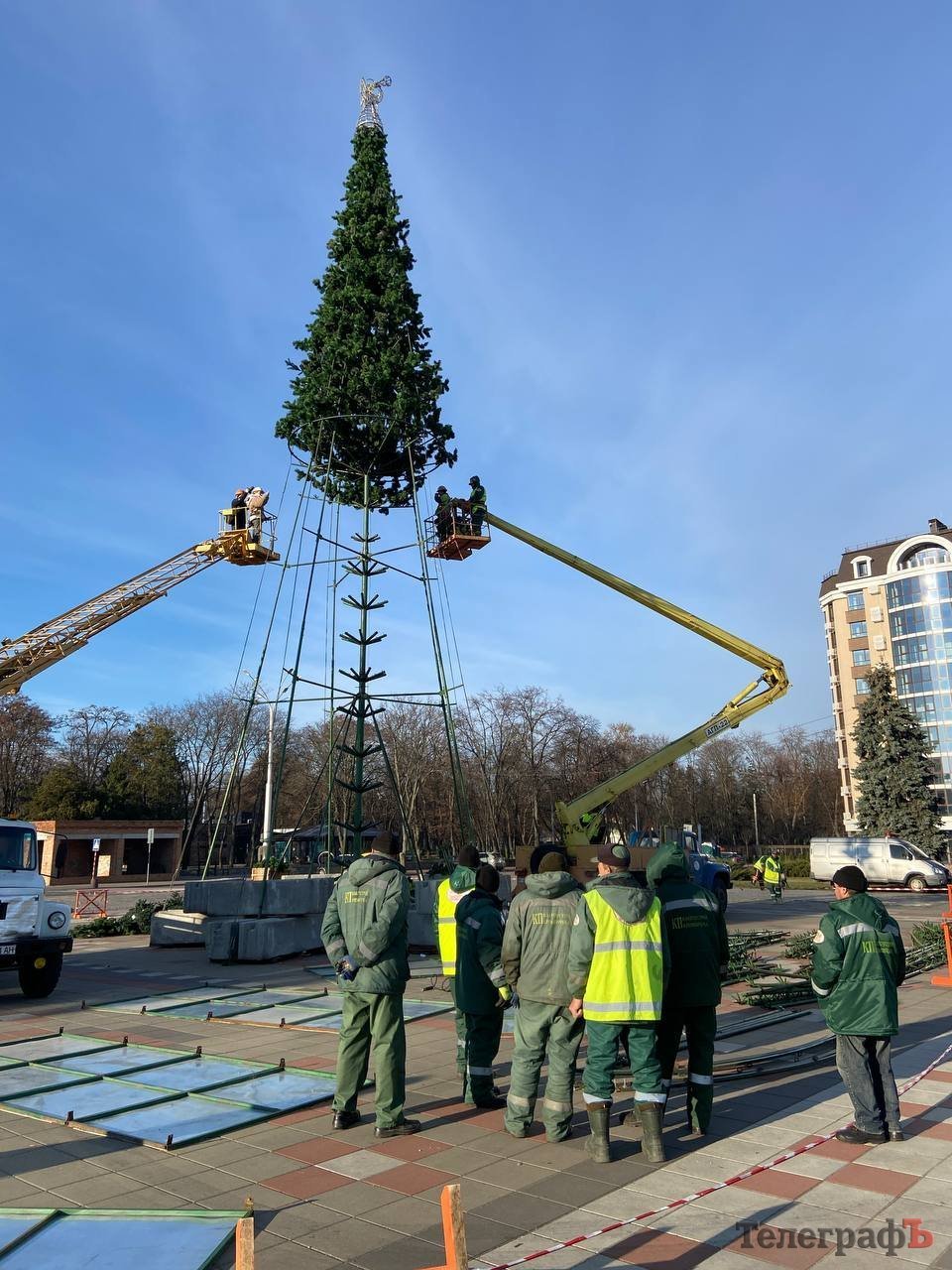 Продовжується встановлення головної ялинки — комунальники вже монтують штучні зелені гілки на арку та каркас, які з’явилися на площі Перемоги у суботу, 2 грудня. На верхівці ялинки вже можна побачити янгола.