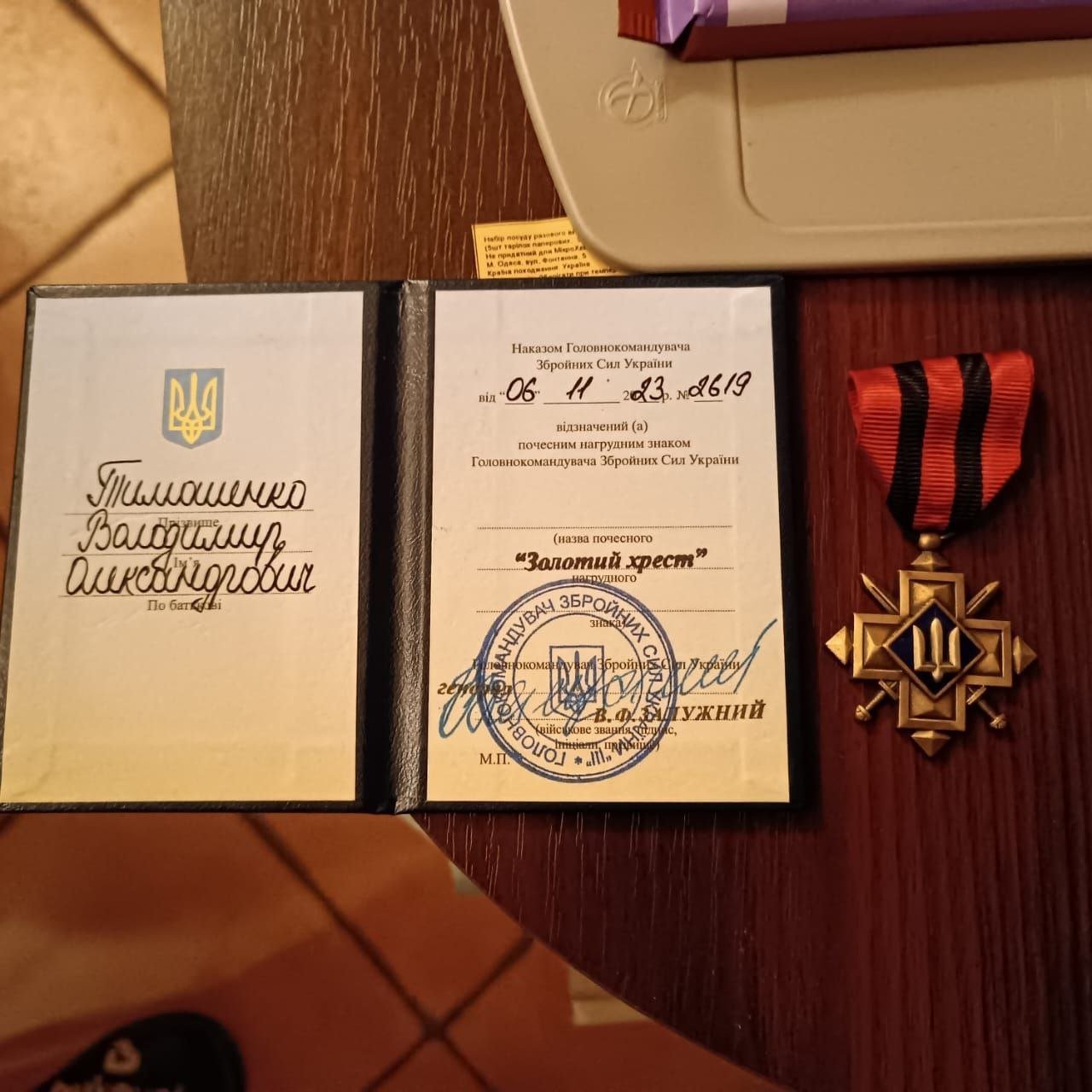 Кременчужанин Володимир Тимошенко отримав нагрудний знак «Золотий хрест» від Головнокомандувача Збройних Сил України Валерія Залужного. Такою інформацією із «Кременчуцьким Телеграфом» поділилися знайомі Володимира.