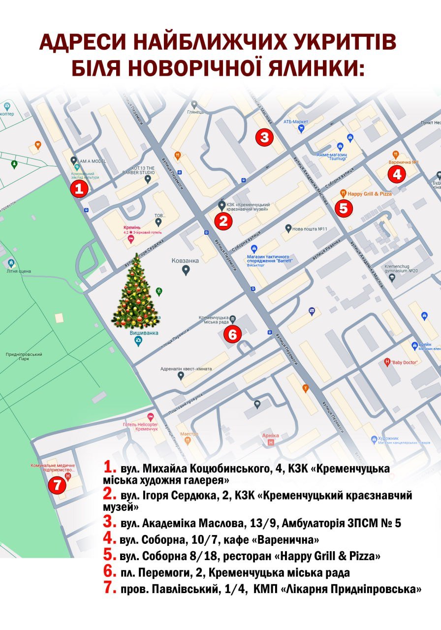 7 грудня мерія Кременчука оприлюднила схему найближчих до новорічної ялинки укриттів. За інформацією пресслужби, з міркувань безпеки масових заходів цьогоріч проводити не будуть: на площі не встановлюватимуть сцену та не проводитимуть новорічний ярмарок.