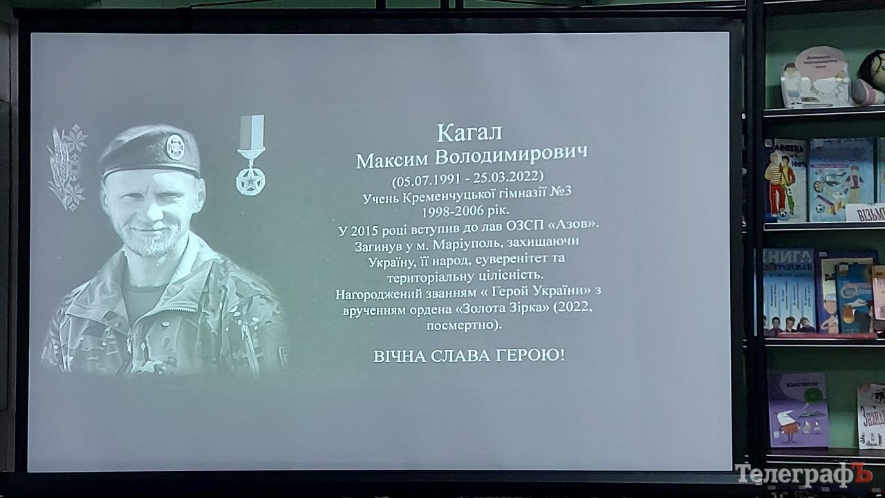 Друга меморіальна дошка — на честь Героя України Максима Кагала. Його дядько Олег Кагал на засіданні розповів, що її вирішили розмістити на фасаді Кременчуцької гімназії №3, де навчався Максим з 1998 по 2006 роки.