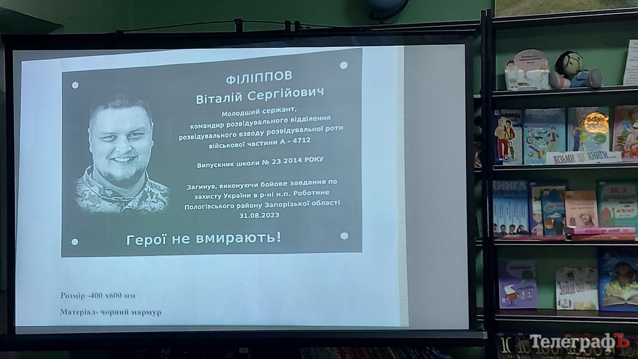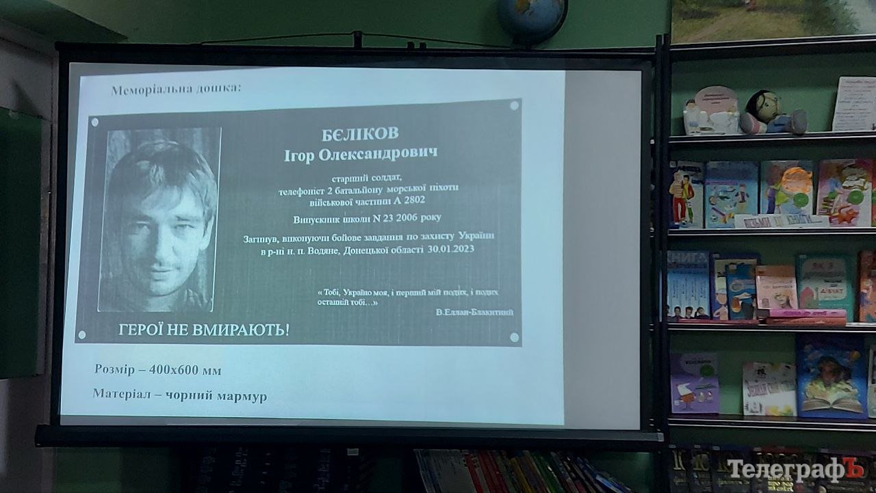 На фасаді Кременчуцької гімназії №23 з’являться три меморіальні дошки, які увічнять пам’ять загиблих на війні випускників — старшого солдата Ігоря Бєлікова, молодшого сержанта Віталія Філіппова, старшого солдата Віталія Базилевського. Про це стало відомо під час засідання комісії з питань найменування об’єктів топоніміки, увічнення пам’яті видатних діячів і подій, встановлення пам’ятних знаків у межах громади.