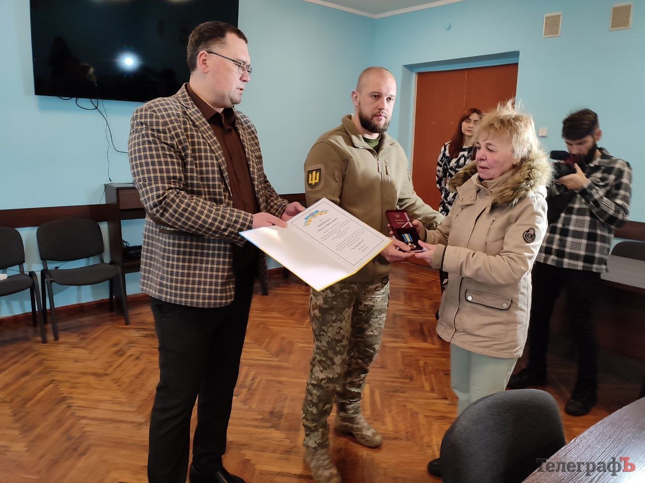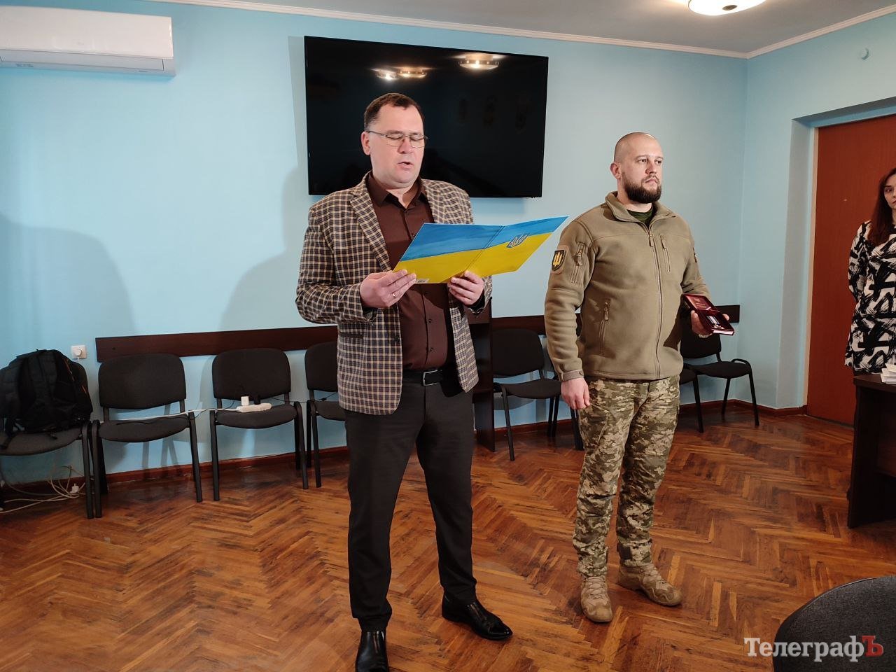 Нагороди від імені Президента України передали заступник начальника Кременчуцької районної військової адміністрації Артем Даценко та виконувач обов’язків начальника Кременчуцького районного територіального центру комплектування та соціальної підтримки (ТЦК та СП) підполковник Мирослав Волков.