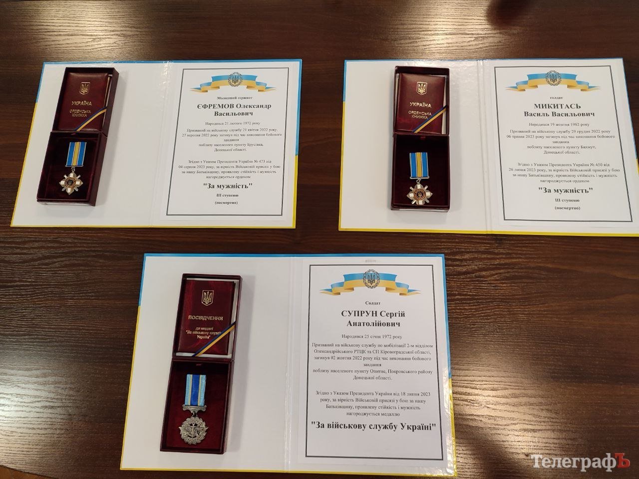 Першим державну нагороду вручили дружині загиблого молодшого сержанта Олександра Васильовича Єфремова. Він був призваний на військову службу 21 квітня 2022 року, а 27 вересня 2022 року загинув, рятуючи життя поранених бійців, поблизу села Брусівка в районі Лиману Донецької області.