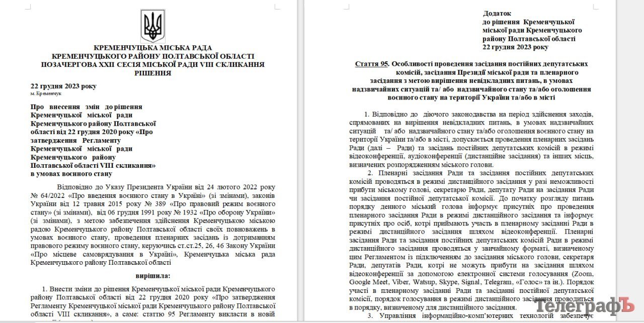 Кременчуцька влада 22 грудня планує змінити Регламент міськради — можновладці на законному рівні зможуть голосувати через електронні системи голосування. До переліку відповідних систем увійшли: Zoom, Google Meet, Viber, Watsup, Skype, Signal, Telegram, «Голос».