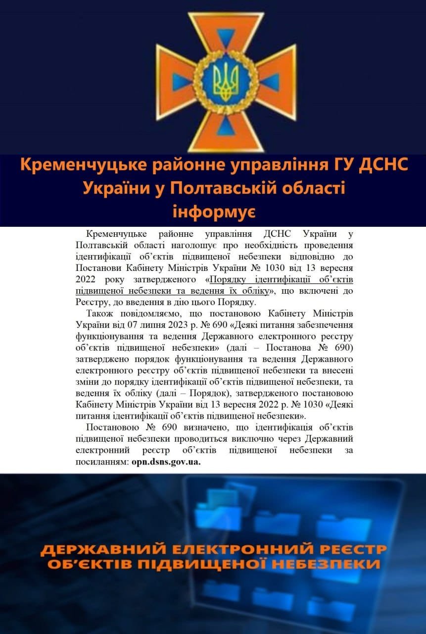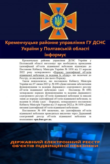 Кременчуцьке райуправління Держаної служби з надзвичайних ситуацій наголошує на необхідності проведення ідентифікації об'єктів підвищеної небезпеки та порядок їх реєстрації.