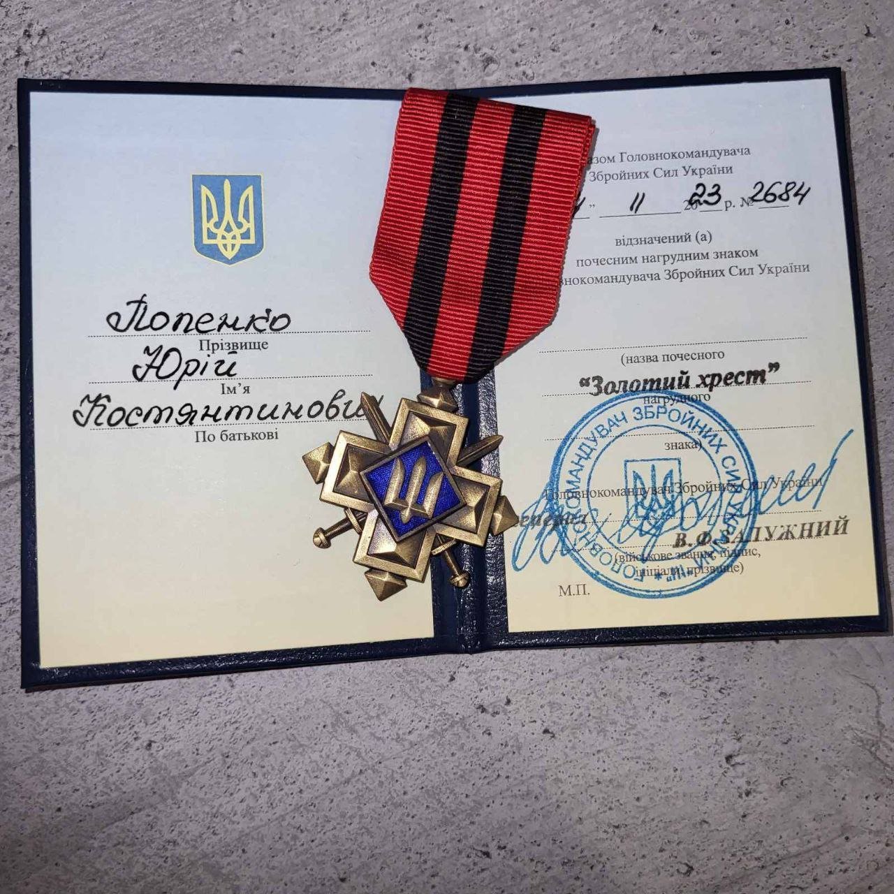 Військовий із Кременчука Юрій Попенко нагороджений почесним нагрудним знаком Головнокомандувача Збройних Сил України «Золотий хрест». Про це «Кременчуцькому Телеграфу» повідомила дружина військового Анастасія.