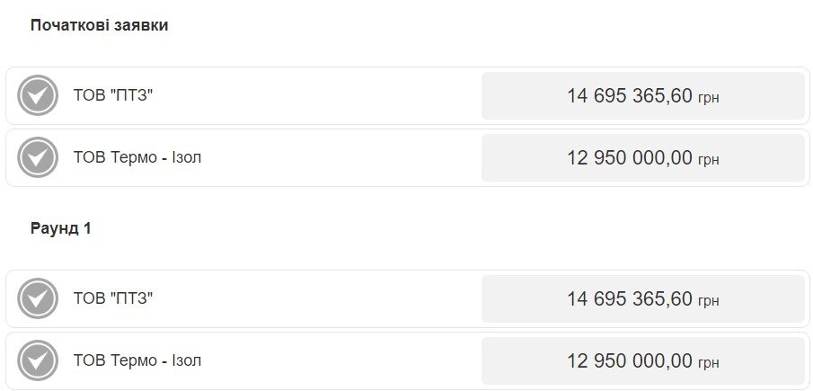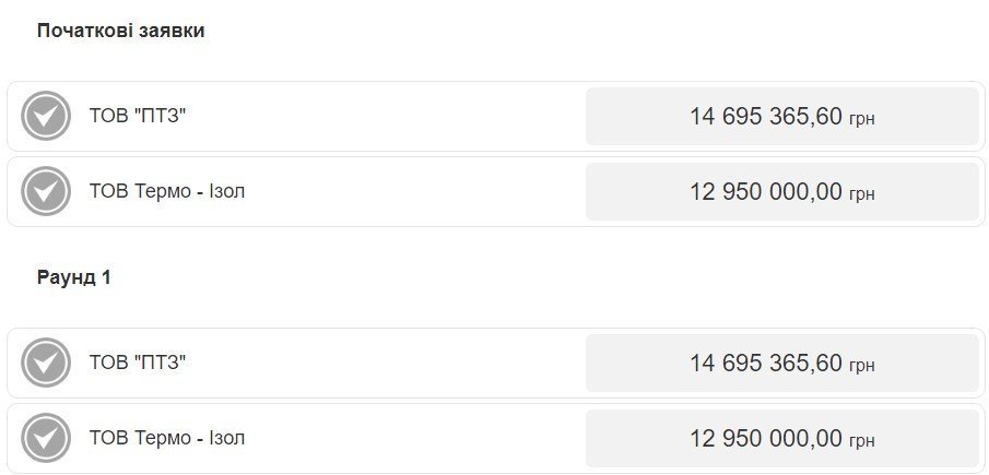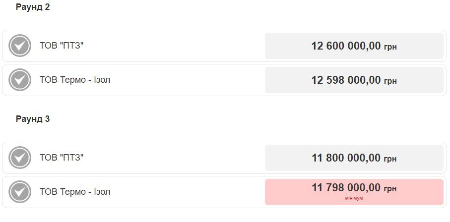 Порівняно з очікуваною вартістю ціна є нижчою на 4 млн 82 тис. грн. На аукціон прийшло два учасники — ТОВ «Термо-Ізол» з м. Городок Львівської області та київське ТОВ «Перший трубний завод» (ПТЗ). Треба зауважити, що остаточна пропозиція ТОВ «Термо-Ізол» складала 7 млн 798 тис. грн, тобто була на 2 тис. грн дешевшою, ніж у конкурента. Проте замовник її відхилив, пославшись на невідповідності: відсутність сертифіката, який вимагала тендерна документація, а також некоректно оформлене забезпечення тендерної пропозиції. ТОВ «Термо-Ізол» виявило недоліки у документації конкурента та склало скаргу до Антимонопольного комітету. Але період оскарження закінчився.