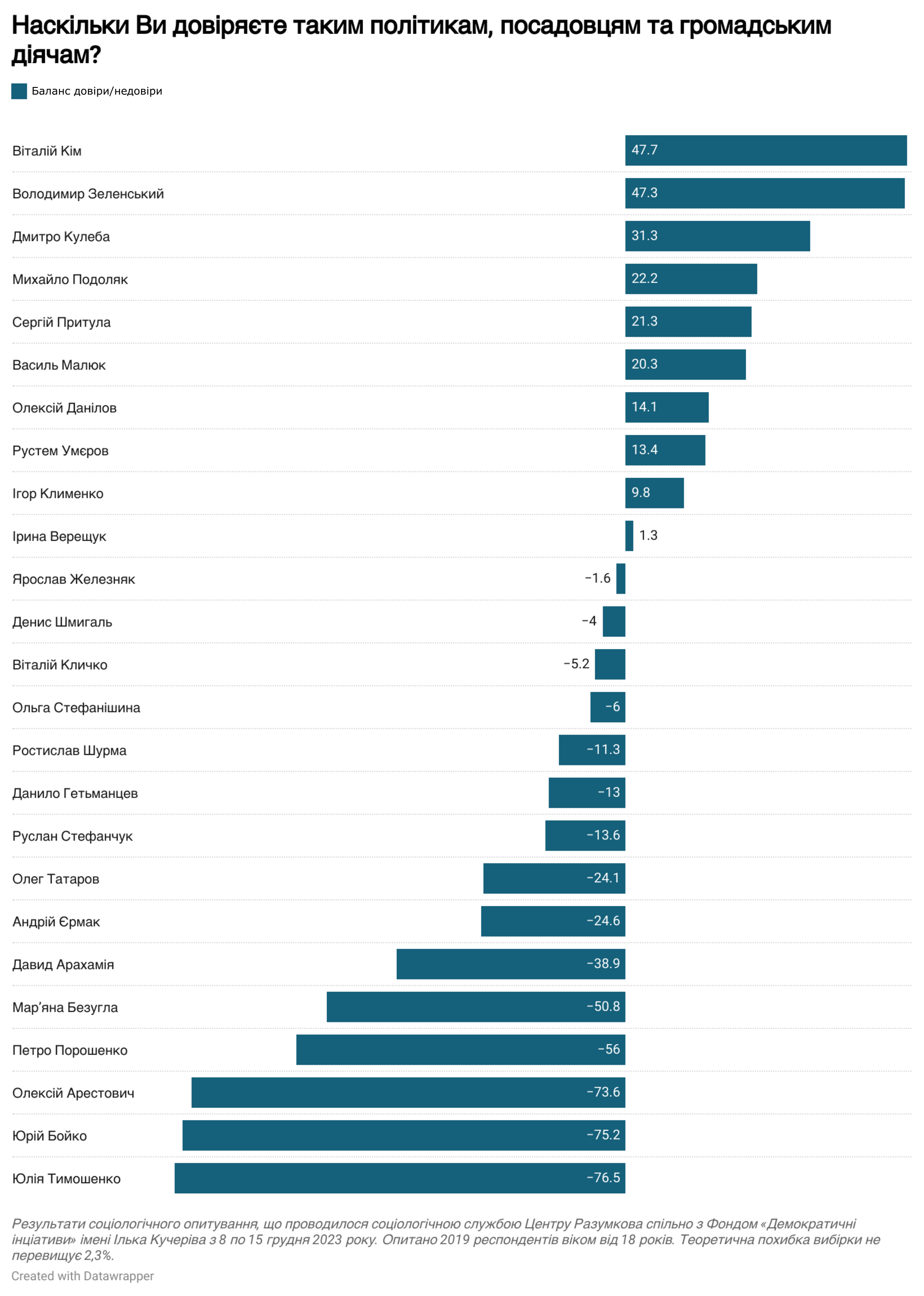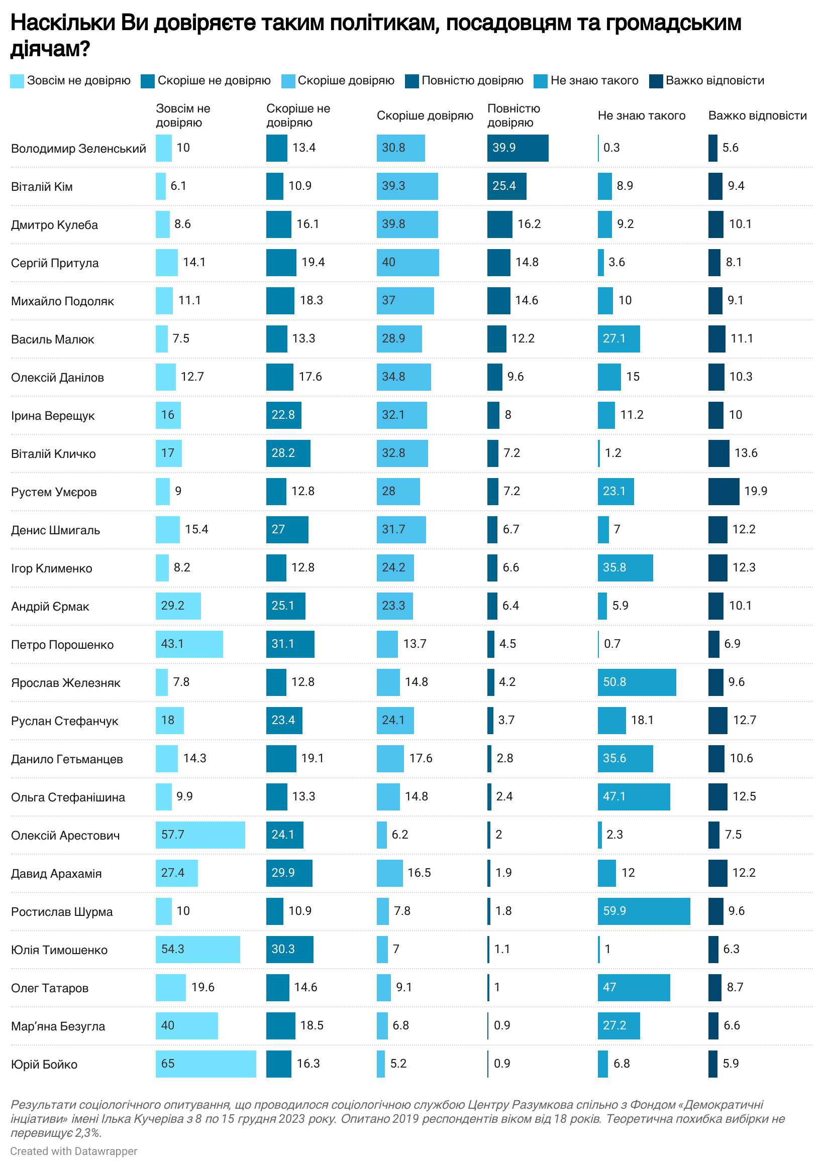 Більшість опитаних не довіряють експрем’єру Юлії Тимошенко (85%), колишньому раднику Офісу президента Олексію Арестовичу (82%), лідеру партії ОПЗЖ Юрію Бойку (81%), п’ятому президенту Петру Порошенку (74%), народним депутатам від «Слуги народу» Мар’яні Безуглій (58,5%) та Давиду Арахамії (57%), а також керівнику Офісу президента Андрію Єрмаку (54%).