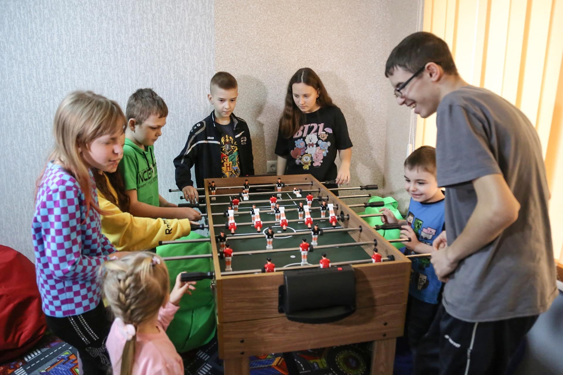 Дитяча кімната обладнана м’якими меблями, де маленькі переселенці зможуть грати в настільні ігри та займатися творчістю.