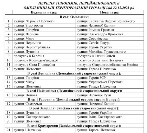 Нові назви тепер мають 46 вулиць і провулків Омельницької територіальної громади Кременчуцького району. Зміни набули чинності після рішення сесії, яка відбулася 22 грудня. В українській топоніміці відображено сотні, якщо не тисячі «героїв» тоталітарних режимів, причетних до масових політичних репресій, Голодомору, боротьби проти становлення української держави. Сьогодні процес перейменування набуває форми цілеспрямованої державної політики й зміна назв топонімів відбувається на виконання вимог Закону №3005-IX «Про засудження та заборону пропаганди російської імперської політики в Україні й деколонізацію топонімії».