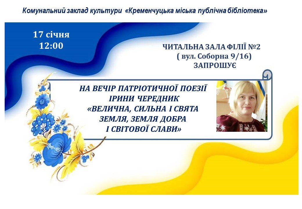 Кременчуцька міська публічна бібліотека запрошує на вечір патріотичної поезії Ірини Чередник «Велична, сильна і свята земля, земля добра і світової слави». Як повідомляє пресслужба Кременчуцької міської ради, захід присвячений Дню Соборності України.