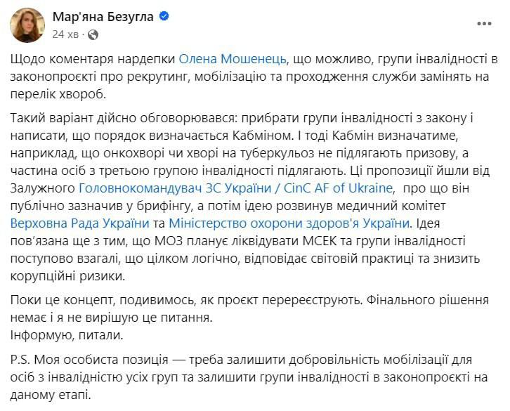 Групи інвалідності в законопроєкті про рекрутинг, мобілізацію та проходження служби хочуть замінити на перелік хвороб. Про це повідомила заступниця голови комітету з питань національної безпеки, оборони й розвідки Мар’яна Безугла на своїй сторінці у Фейсбуці.
