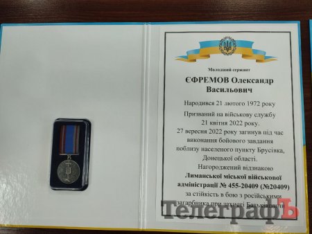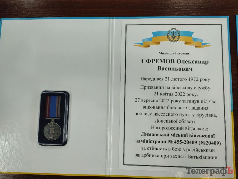 Першим державну нагороду вручили дружині загиблого молодшого сержанта Олександра Васильовича Єфремова. Він народився 21 лютого 1972 року. До війни зі своєю родиною жив у селі Піщане.
