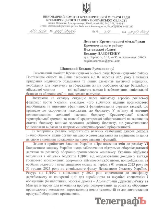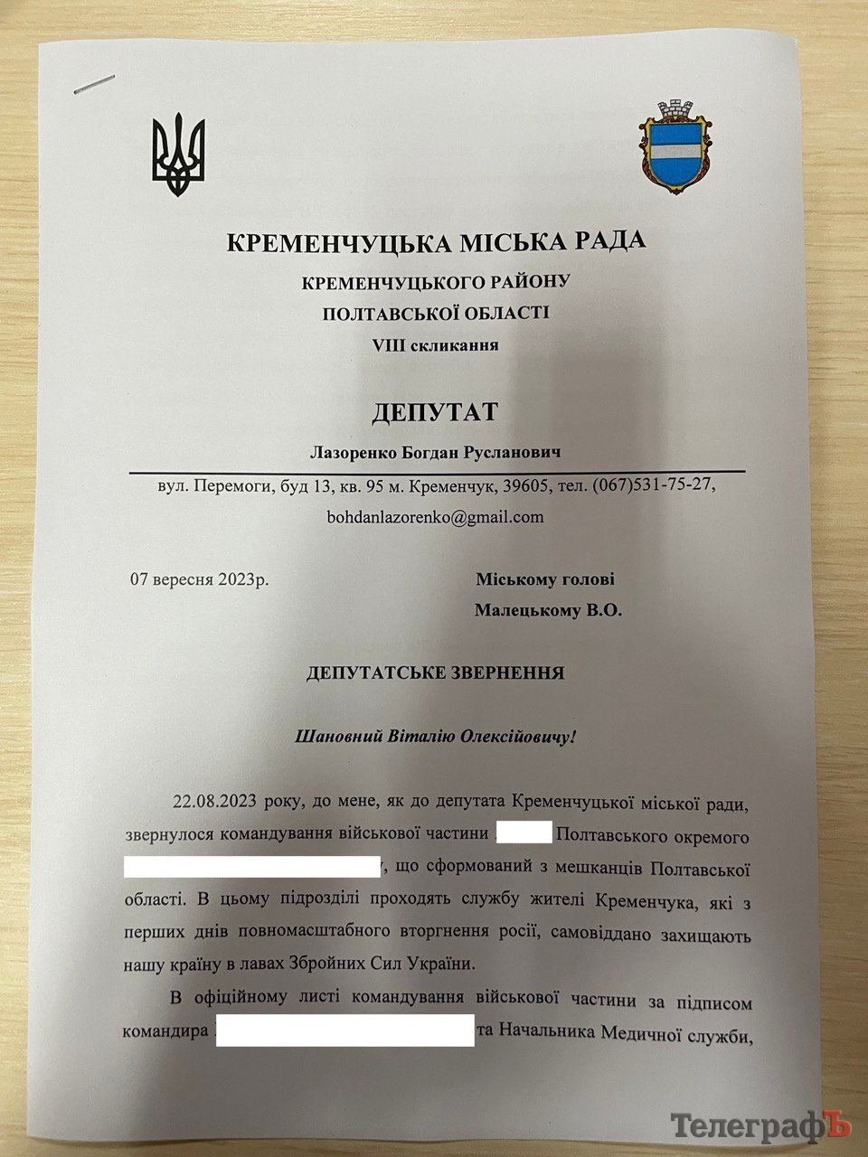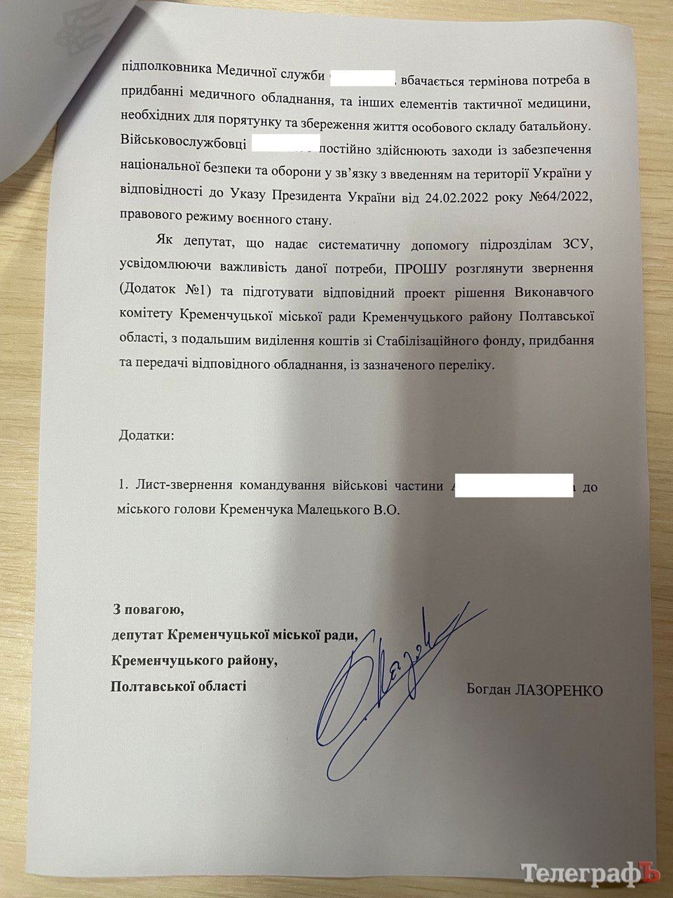 Депутат також надав редакції своє звернення, зі змісту якого випливає, що в ще в вересні минулого року, він звертався до міського голови з проханням виділити кошти зі Стабілізаційного фонду на придбання медичного обладнання та елементів тактичної медицини для потреб однієї з військових частин з Полтавщини. У зверненні депутат зазначив, що усе вищевказане необхідне для порятунку та збереження життя особового складу батальйону. Богдан Лазоренко також вказав, що у цьому батальйоні проходять службу численні жителі з Кременчука. До звернення був долучений лист, адресований міському голові Малецькому, який підписали командир військової частини та начальник Медичної служби.