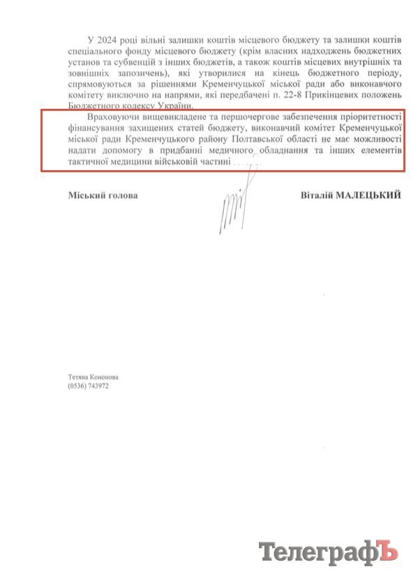 Посилаючись на усе вищевикладене та на необхідність першочергового фінансування захищених статей бюджету, Виконавчий комітет, «не має можливості допомогти з придбанням медичного обладнання та елементів тактичної медицини, що звичайно викликає низку питань».