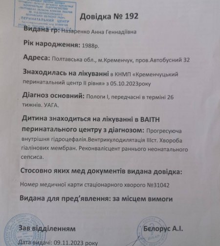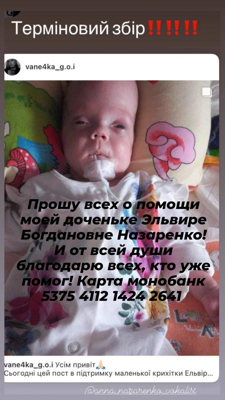 До редакції «Телеграфа» звернулася кременчуцька вокалістка Анна Назаренко з проханням до усіх небайдужих допомогти у лікуванні її 3-місячної доньки. Родині потрібні гроші на операції та довготривалу реабілітацію.