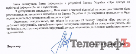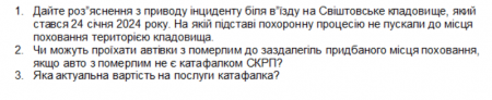 2 лютого 2024 року «Кременчуцький Телеграф» отримав відповідь на свій запит. У відповіді йдеться, що запитувана нами інформація, в розумінні закону України «Про доступ до публічної інформації», не є публічною. Тобто інформація про те, «чи можуть проїхати автівки з померлим до заздалегідь придбаного місця поховання, якщо авто з померлим не є катафалком СКРП» не є такою, яка потребує публічного висвітлення, на думку керівництва СКРП.