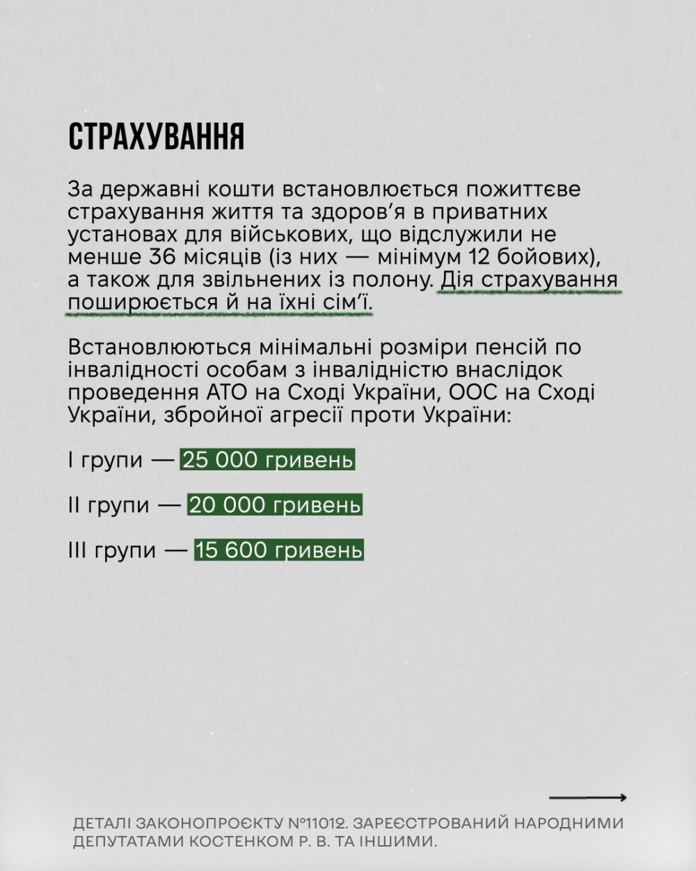 Розробники законопроєкту пропонують й інші пільги для військових, серед яких — страхування життя, знижки на розмитнення авто від 50% до 100% залежно від строку служби, пільгову іпотеку та кредити для відкриття бізнесу.