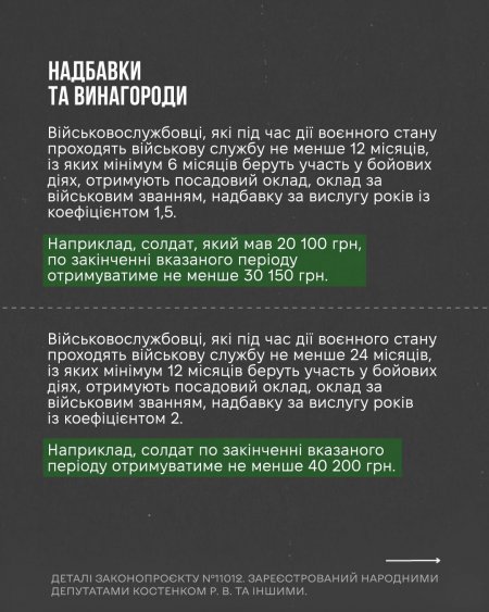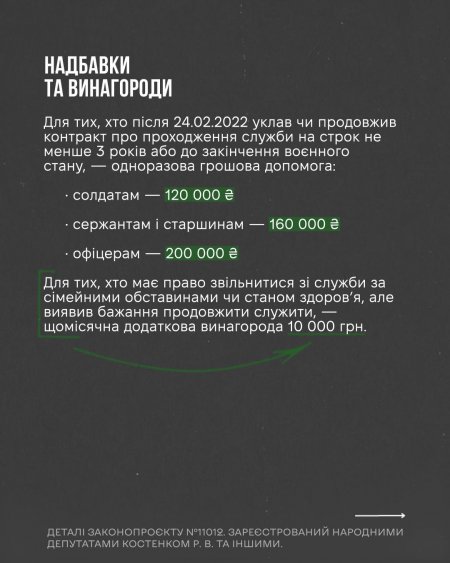 Для тих, хто уклав, або продовжив контракт на проходження військової від 3-х років або до закінчення воєнного стану пропонується ввести одноразову грошову винагороду: