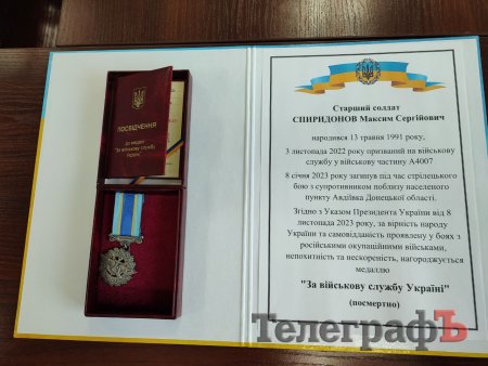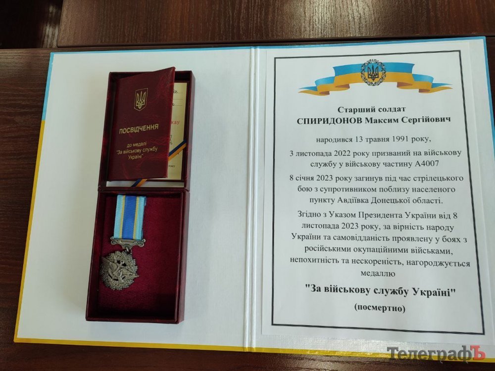 Посмертну нагороду старшого солдата Спиридонова Максима Сергійовича — медаль «За військову службу Україні» — отримала його дружина разом з донечкою.