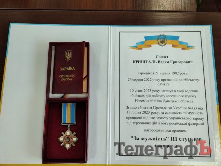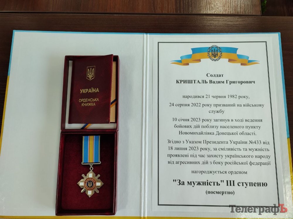 Орден «За мужність» ІІІ ступеня передали дружині солдата Кришталя Вадима Григоровича.