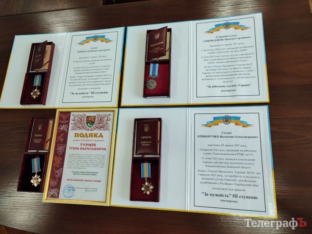 Сьогодні, 27 лютого, в Кременчуцькій районній військовій адміністрації вручили нагороди родинам чотирьох загиблих воїнів. Посмертні нагороди від імені Президента України рідним полеглих Героїв передали заступник начальника Кременчуцької районної військової адміністрації Артем Даценко та начальник Кременчуцького районного територіального центру комплектування та соціальної підтримки (ТЦК та СП) підполковник Мирослав Волков.