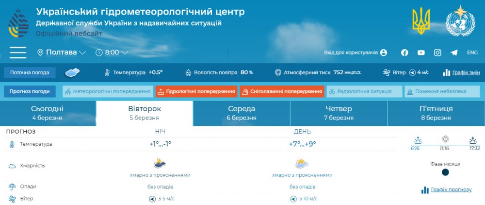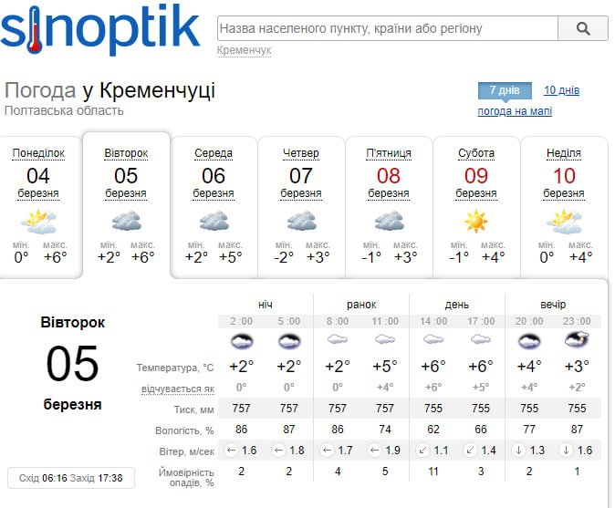 У вівторок, 5 березня у Кременчуці протягом усього дня погода буде похмурою.
